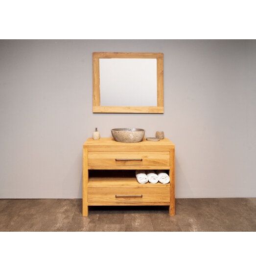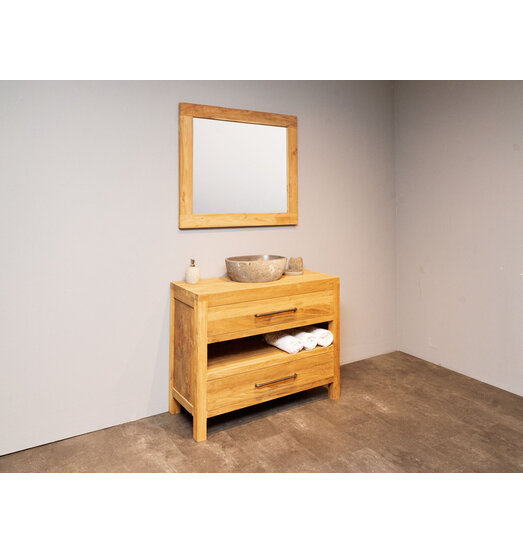 De bijpassende grote spiegel heeft een stijlvolle rand van naturel teakhout. Deze rand is 3 cm dik en 12 cm breed.