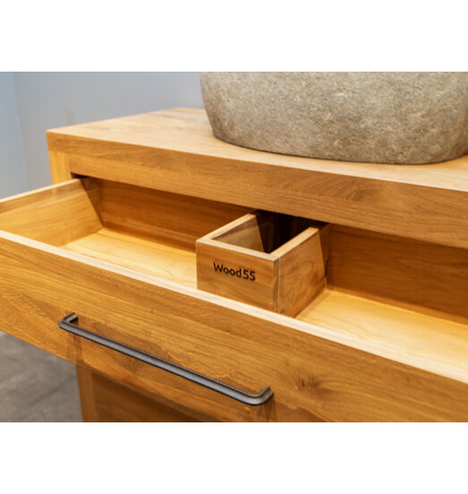 De meubelen in deze set zijn gemaakt van 100% teakhout. Aangezien het gebruikte hout gerecycled teakhout is, kan het door luchtvochtigheid en temperatuurverschillen licht gaan werken. Wij raden daarom aan om de lades van het badmeubel door uw installateur nauwkeurig af te laten stellen.