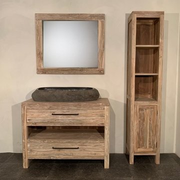Das Badezimmermöbel ist vollständig aus recyceltem Teakholz in einer White-Wash-Farbe gefertigt. In den zwei großen Schubladen finden all Ihre Badprodukte Platz. Die Mittelfläche ist offen gestaltet und bietet Platz für beispielsweise Handtücher. Das große ovale Waschbecken ist aus Naturstein mit einer wunderschönen natürlichen Form gefertigt. Sie können dieses selbst auf den Badezimmerschrank installieren. Die Löcher sind noch nicht gebohrt, sodass Sie selbst die Position des Waschbeckens bestimmen können.