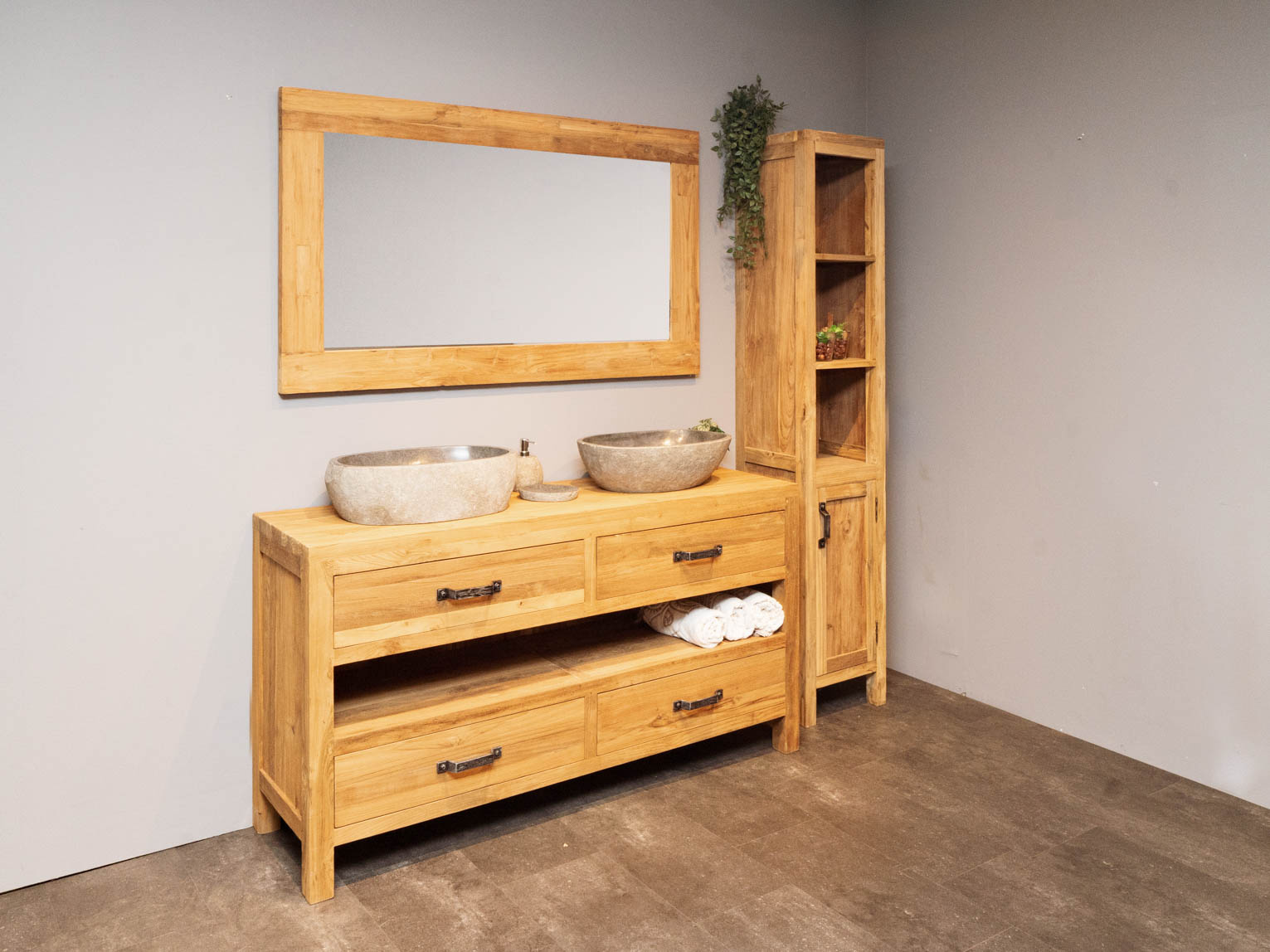 Das Badmöbel ist aus hochwertigem recyceltem Teakholz gefertigt. Es verfügt über zwei Schubladen, die Sie mit den schwarzen Vintage-Griffen öffnen können. Darüber hinaus hat es ein offenes Mittelteil zum Verstauen von zum Beispiel Handtüchern. Die Waschbecken aus Naturstein zeichnen sich durch ihre graue Farbe und natürliche runde Formen aus. Das Badmöbel wird ohne Bohrlöcher geliefert, sodass Sie selbst entscheiden können, wo Sie die Waschbecken montieren.