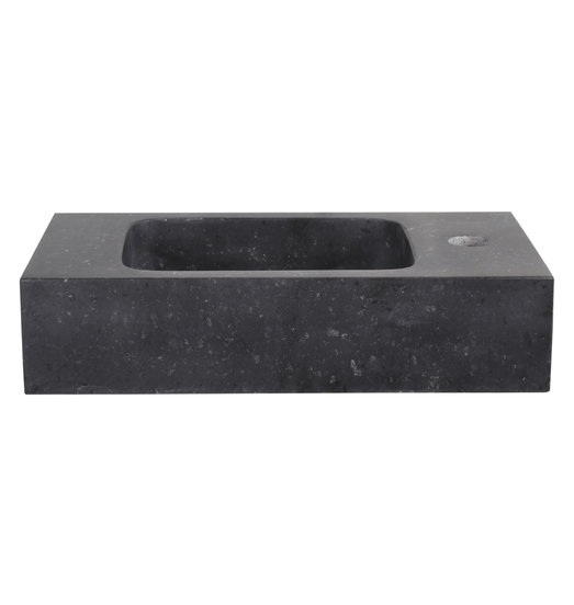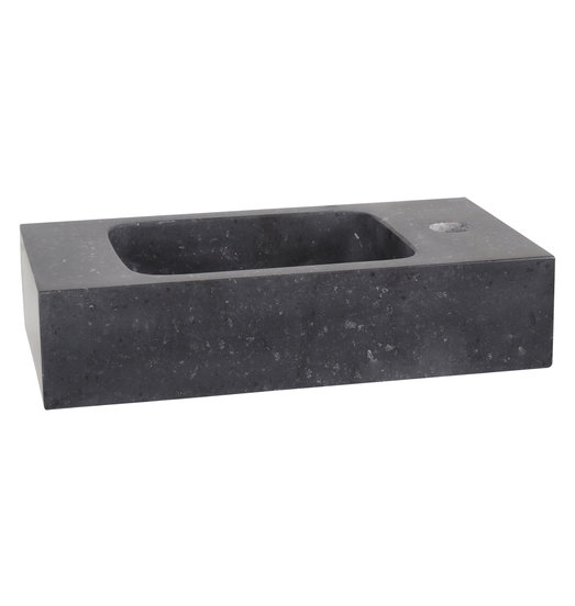 Das elegant verarbeitete Naturstein-Waschbecken Bombai Black hat das Hahnloch auf der rechten Seite. Der Naturstein ist ein natürliches Material, das Ihrem Toilettenraum ein sehr luxuriöses Aussehen verleiht.