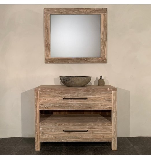 Der passende Spiegel hat einen stilvollen Rahmen aus naturbelassenem Teakholz. Dieser Rahmen ist 3 cm dick und 12 cm breit.