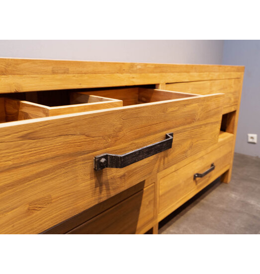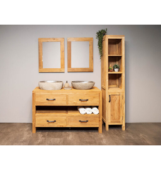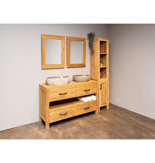 Der dazugehörige Schrank ist ebenfalls aus recyceltem Teakholz gefertigt. Dieser Schrank hat drei offene Fächer und zwei Fächer mit einer Tür. In diesem Schrank finden Sie genügend Platz für Ihre Badprodukte.