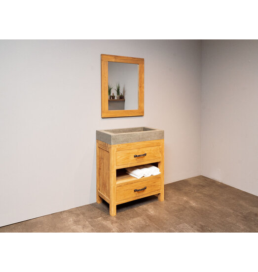 Das Badmöbel ist aus hochwertigem recyceltem Teakholz gefertigt. Es verfügt über zwei Schubladen, die Sie mit den schwarzen, industriellen Griffen öffnen können. Darüber hinaus hat es einen offenen Mittelteil zur Aufbewahrung von Handtüchern und anderem. Das Natursteinwaschbecken zeichnet sich durch seine graue Farbe und natürliche runde Form aus. Das Badmöbel wird ohne Bohrlöcher geliefert, sodass Sie selbst bestimmen können, wo Sie das Waschbecken montieren.