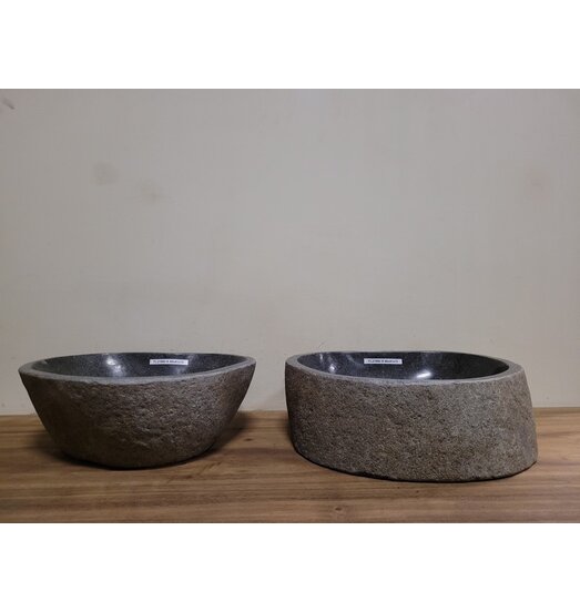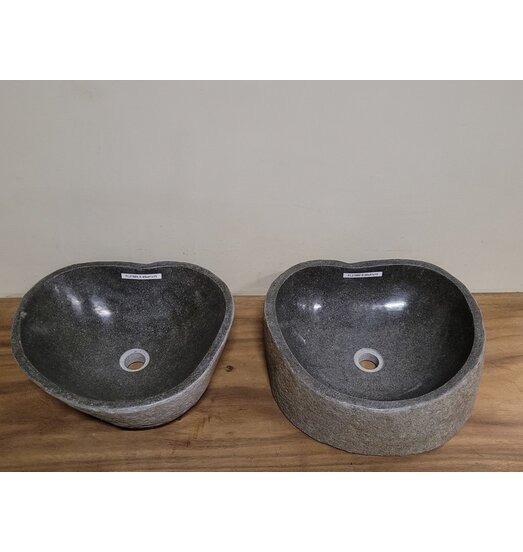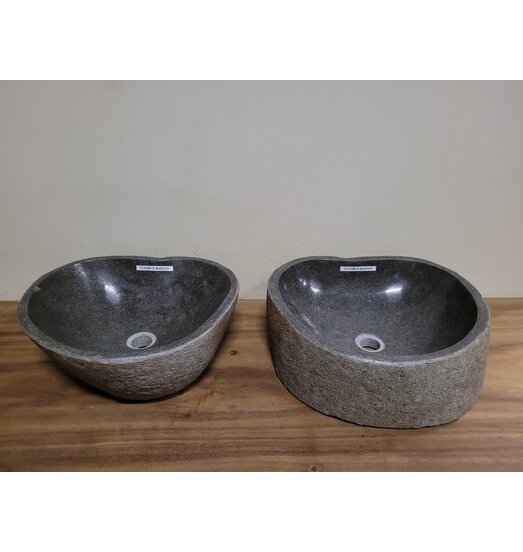 Deze stenen twinset waskommen van riviersteen heeft nummer FL21880 en een gewicht van ongeveer 23/38 kg per waskom. De afmeting van deze waskommen is +/- 46x41x15cm.
