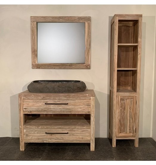 Het wastafelonderkast is volledig gemaakt van gerecycled teakhout in een white wash kleur. In de twee grote lades is ruimte voor al uw badkamerproducten. Het middenstuk is open gelaten en biedt plaats voor bijvoorbeeld handdoeken. De grote ovale wasbak is gemaakt van natuursteen met een prachtige natuurlijke vorm. U kunt deze zelf op het badmeubel installeren. De gaten zijn nog niet aangebracht, zodat u zelf de positie van de wasbak kunt bepalen.