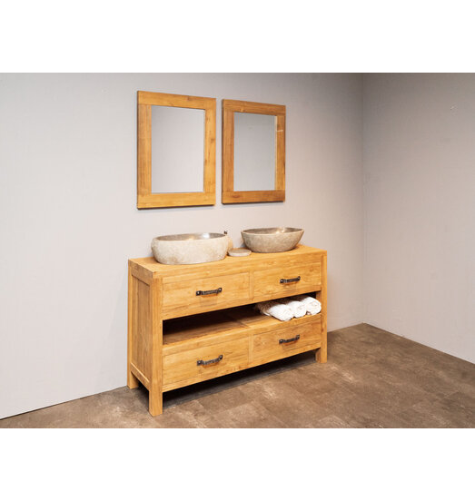 De bijpassende spiegels hebben een stijlvolle rand van naturel teakhout.