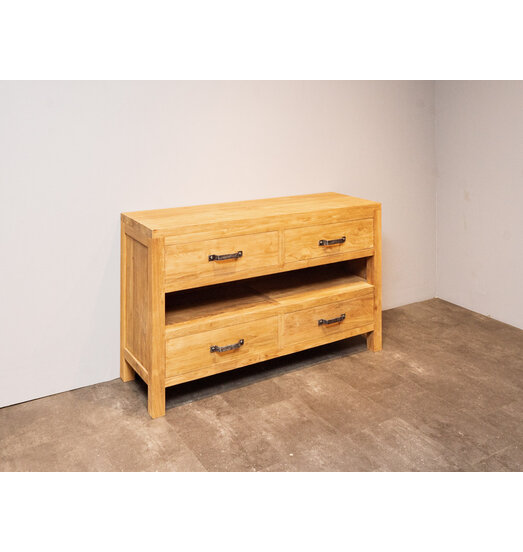 Het badkamermeubel heeft vier stevige lades met zwarte handgrepen. Het middenstuk van het meubel is open. Hier kunt u bijvoorbeeld uw handdoeken neerleggen. Op het stevige bovenblad van het meubel kunt u de twee waskommen van natuursteen plaatsen. De gaten zijn nog niet aangebracht, zodat u zelf de indeling kunt bepalen.