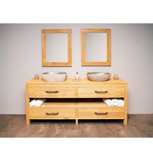 De bijpassende spiegels hebben een stijlvolle rand van naturel teakhout.