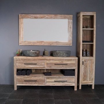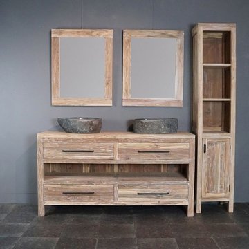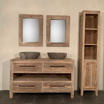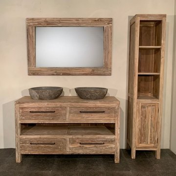 Wood55 levert diverse badmeubelsets welke bestaan uit een gerecycled teak badmeubel/onderkast, een spiegel en een natuurstenen waskom. Meer ruimte nodig? Neem een teak badmeubelset met een hoge badkamerkast, hierdoor creëert u meer opbergruimte in uw badkamer en blijft deze altijd net opgeruimd.