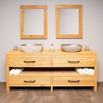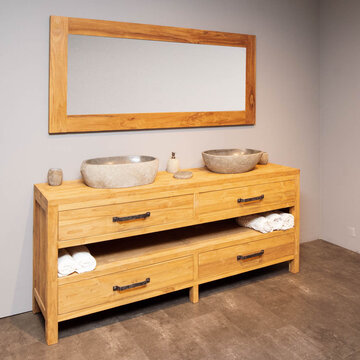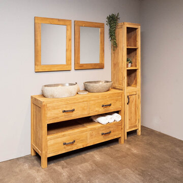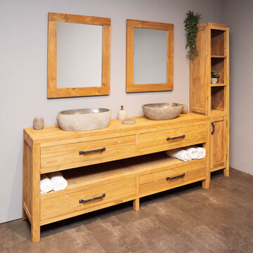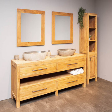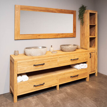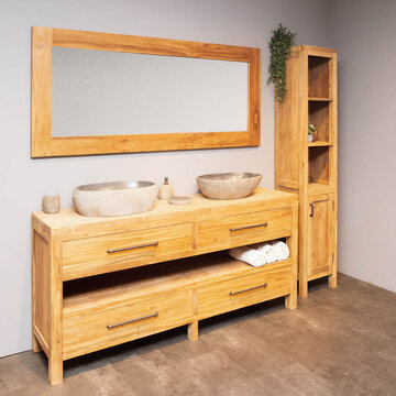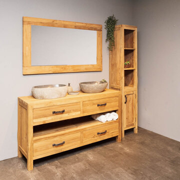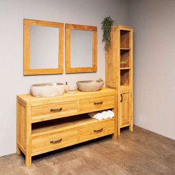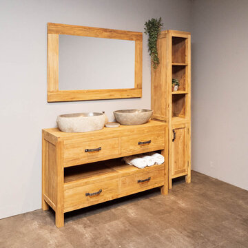 Een compleet badkamermeubelset van teakhout voor uw badkamer. Door onze collectie uit te breiden met spiegels met teakhouten omlijsting, wandplanken in dezelfde stijl en waskommen van natuursteen en andere badkamer accessoires wordt uw badkamer een optische eenheid.