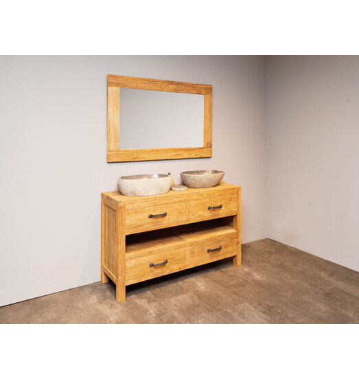 Het teakhouten badmeubel heeft vier stevige lades met zwarte, industriële handgrepen. Het open middenstuk geeft plaats aan bijvoorbeeld handdoeken. Door de vier pootjes staat het meubel 14cm van de grond af. Als u de kast wilt verlagen kunnen de poten gemakkelijk ingekort worden. Wanneer u het badmeubel wilt ophangen kunnen de poten geheel verwijderd worden. Op het stevige bovenblad is plek voor de twee bijgeleverde natuurstenen waskommen. Door hun natuurlijke ronde vorm zijn deze waskommen echte blikvangers in uw badkamer. Er zijn nog geen boorgaten aangebracht, zodat u zelf de mogelijkheid heeft om de ideale plaats voor de waskommen te bepalen.