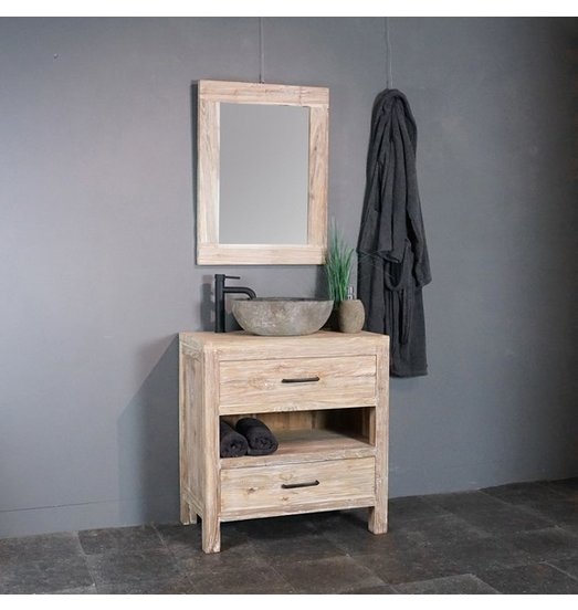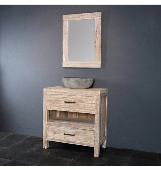 Bij het Teak badkamermeubelset 80cm White Wash behoort ook een spiegel, uitgevoerd met een extra stevige rand van 9cm breed en 3cm dik. Benieuwd naar alle specificaties van het set? Bekijk de specificaties. De waskom wordt geleverd zonder sifon en afvoerplug.