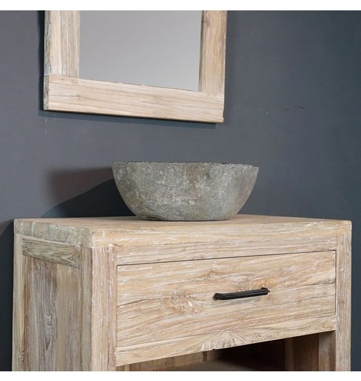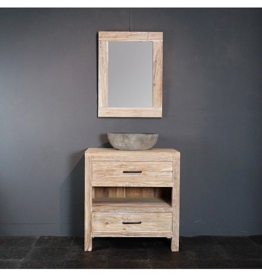 Teak badmeubelset 80cm White Wash met waskom en spiegel