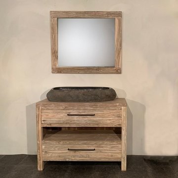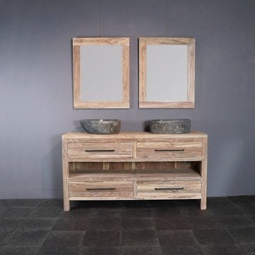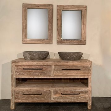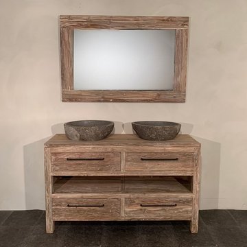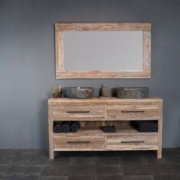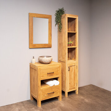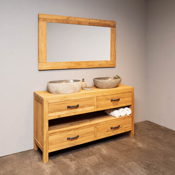 In de prachtige teakhouten badkamersets van WOOD55 komen al deze aspecten terug. De meubelen zijn namelijk gemaakt van gerecycled teakhout. Dit materiaal is van nature olieachtig waardoor het een waterafstotende werking heeft. Het is daarom zeer geschikt voor vochtige ruimtes als een badkamer. Ook qua stijl zijn onze sets een lust voor het oog. Het heeft een robuuste look die goed aansluit bij een landelijke, klassieke, maar ook industriële stijl.